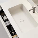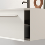 Enhance your space with an artisanal floating bathroom vanity piece. Crafted from engineered wood with a lacquered finish, it features a sintered stone countertop and a rectangular white ceramic sink. The base cabinet offers ample full-extension drawers for all your toiletries and bathroom essentials. Completing this vanity is a side cabinet with glass shelves for the finishing touch.